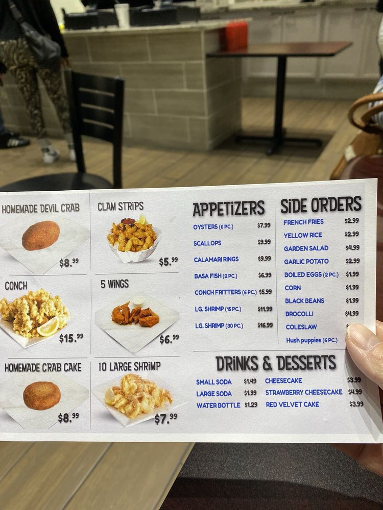 3 pieces fish, 10 pieces large Shrimp, 6 pieces oysters, 1/2 lb. scallops & fries.